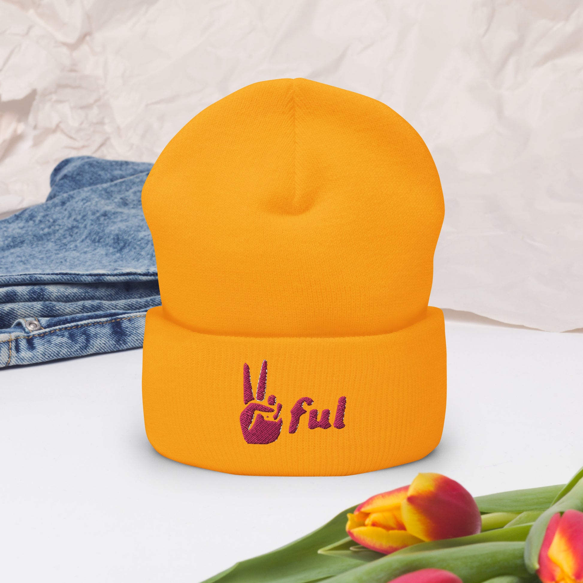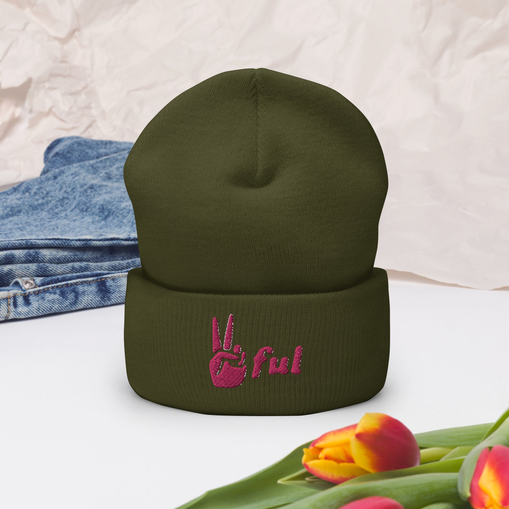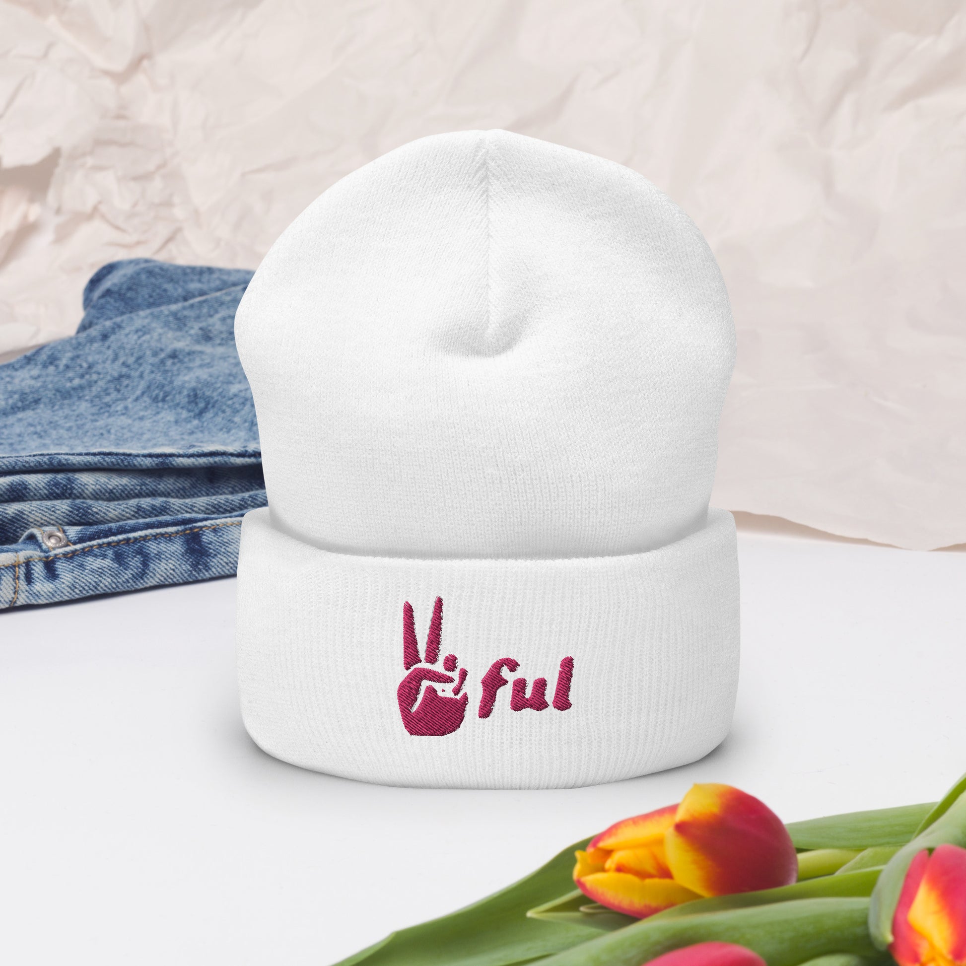 Peaceful Pink Embroidered Cuffed Beanie